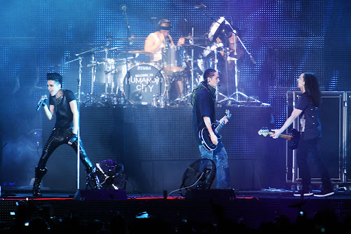 After Wonder Girls's performance, there was a VJ Hunt Finalist show... Now the problem cames up, the rain is more heavily but Tokio Hotel still not on the stage... Hear that the stage was flood by the heavily water and they are busying overcome the technical problem(electric shock), all the fans here just can waiting there under the rain for almost 40 minutes! But when Tokio Hotel is finally performed on the stage at 9.40pm, everyone seen to be high now, jumping with the songs, singing with them. Bill's outfit is so cool and sharp!